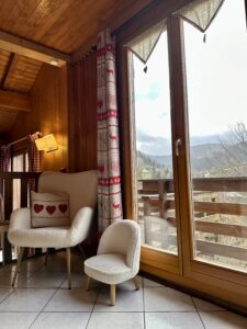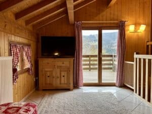 La terrasse de 30 m2, exposée plein sud, offre une vue dégagée sur la montagne et le village. On peut y apprécier le lever et le coucher du soleil.